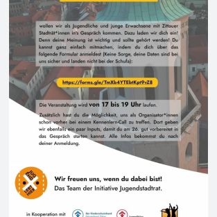 Ihr möchtet in Zittau.eu mitentscheiden und mitreden? Ihr wolltet schon immer mal die Möglichkeit haben, gemeinsam mit anderen Jugendlichen, mit den Menschen zu sprechen, die in Zittau wichtige politische Entscheidungen treffen?