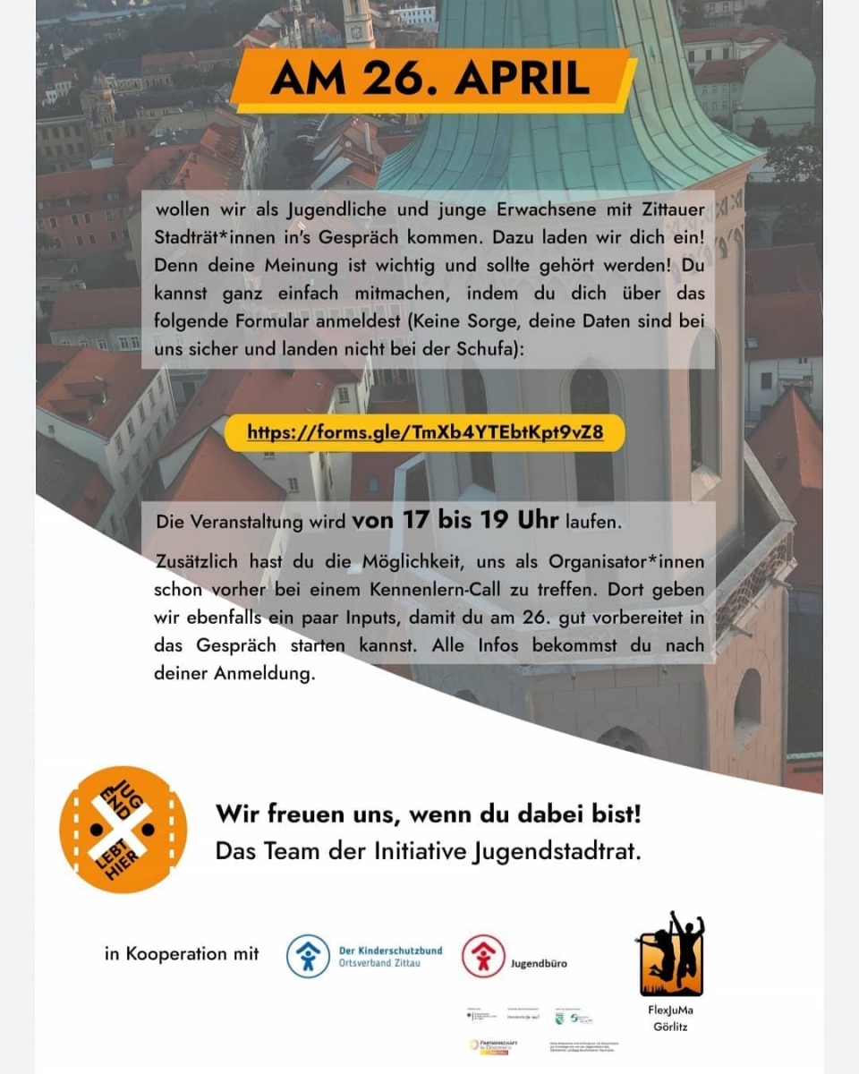 veranstaltet in Kooperation mit uns und dem Jugendbüro DKSB OV Zittau / Deutscher Kinderschutzbund OV Zittau e.V. eine Online-Dialogveranstaltung, in der ihr mit den Stadträt*innen Zittaus ins Gespräch kommen und eure Fragen stellen könnt! Unterstützt wird die Veranstaltung noch vom Kinder-und Jugendring Sachsen e.V.