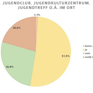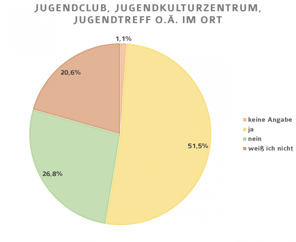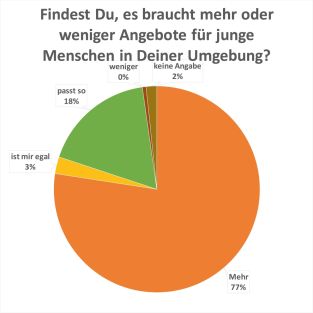 Bei der Freizeitgestaltung wurde unter anderem erfragt, wie Jugendclubs, Jugendkulturzentren und ähnliche Einrichtungen (im weiteren als Jugendeinrichtungen bezeichnet) dazu genutzt werden, aber auch welche weiteren Angebote (kostenlos oder kommerziell) wahrgenommen werden oder welche es im Landkreis braucht, damit Jugendliche und junge Menschen die Region attraktiver finden. 52% aller Teilnehmenden gaben an, es gäbe eine Jugendeinrichtung in ihrem Wohnort, 27% verneinten dies, während 21% nicht wissen, ob eine Einrichtung dieser Art vorhanden ist. 57% derer, die angaben, eine Jugendeinrichtung zu kennen, gaben weiter an, diese aber nie zu nutzen. 19% nutzen sie sehr selten, 12% gelegentlich und 12% regelmäßig. Die Anzahl der Besucher*innen der Jugendclubs ist also gering. Diejenigen Teilnehmenden, die allerdings keinen Zugang zu einer Jugendeinrichtung haben (unabhängig davon, ob keine vorhanden oder diese denjenigen einfach nicht bekannt sind) gaben zu 60% an, sich eine solche zu wünschen. Des Weiteren wurden die Teilnehmenden dahingehend befragt, ob ein Wunsch nach mehr oder weniger Freizeitangeboten besteht und welche Freizeitangebote konkret gewünscht werden. Dabei gaben 77% an, es müsse mehr Freizeitangebote geben, 18% sind der Meinung, die Angebote seien ausreichend, während nicht mal 1% weniger Angebote möchte. Welche Freizeitangebote gewünscht werden, ist in den folgenden Punkten kategorisiert aufgeführt: mehr öffentlich zugängliche Sportangebote, Ausgeh- und Einkaufsmöglichkeiten, (jugendaffine) kulturelle Veranstaltungen, mehr Vereine, politische Events/politische Informationsvermittlung, Treffmöglichkeiten für junge Menschen.