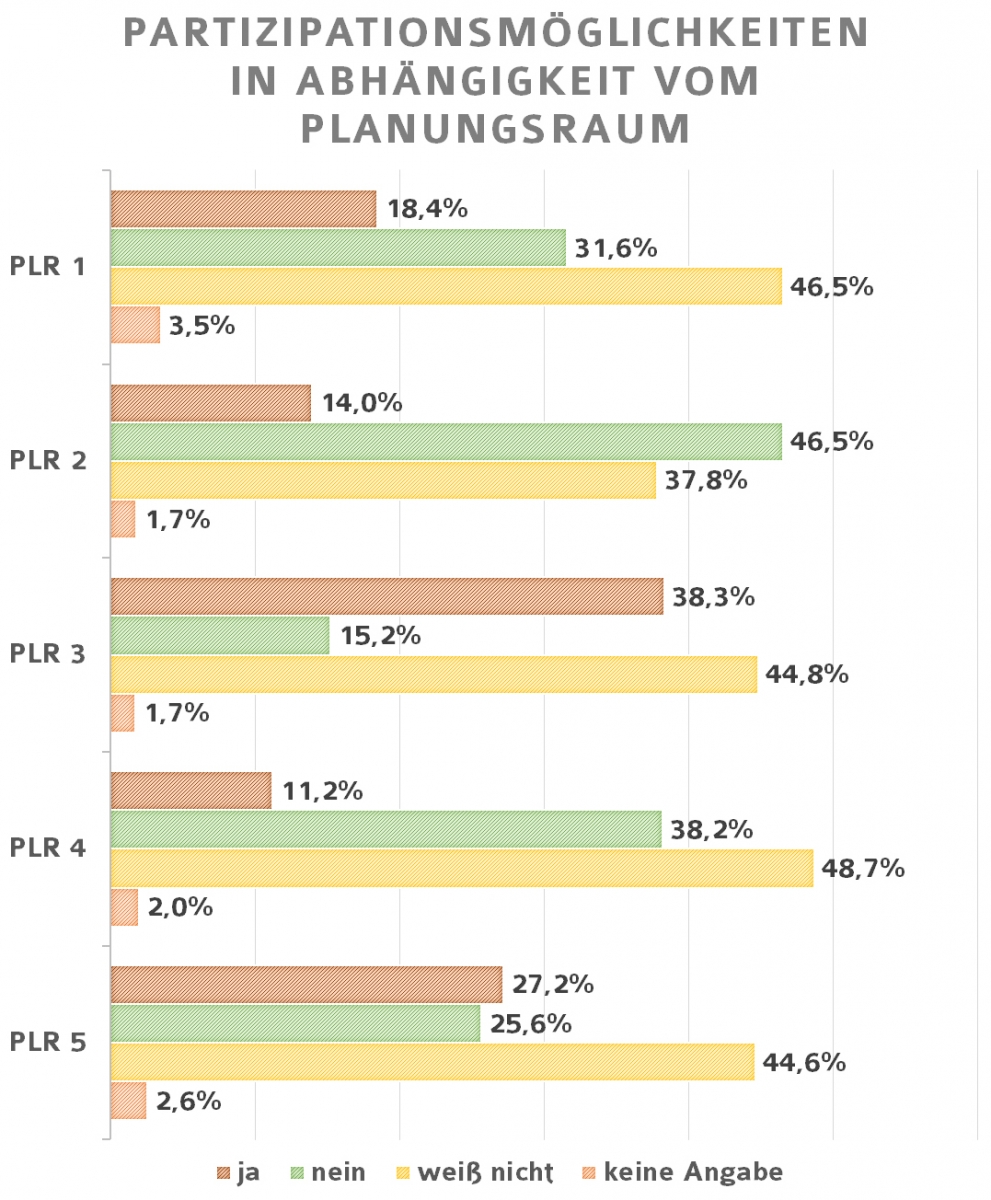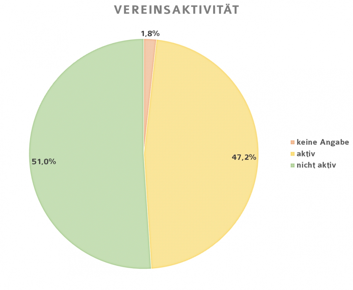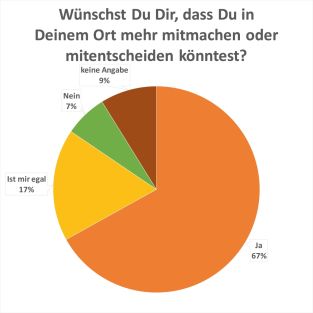 47% aller Teilnehmenden gaben an, in einem Verein aktiv zu sein, während 51% angaben, nicht aktiv zu sein. Beliebt sind besonders Sportvereine. 69% aller in Vereinen aktiven Befragten gaben an, Mitglied in einem Sportverein zu sein. Ca. 30% sind in Vereinen aktiv, die sich mit Sozialem beschäftigen, gefolgt von Musik (19%) sowie Kunst und Kultur (15%). Weitere Angaben zu Vereinen bzw. Themenfeldern der Vereine, in denen junge Menschen aktiv sind, sind unter anderem: (freiwillige) Feuerwehr, Tanzvereine, Karnevalsvereine oder Tier- und Naturschutzvereine. Jedoch ist nicht zu leugnen, dass ein beträchtlicher Teil der Befragten nicht in Vereinen aktiv ist. Gründe hierfür sind vor allem ganz einfach keine Lust (55% aller nicht aktiven), aber auch zu weite Wege (18%) oder kein Verein im Ort (10%), sowie ein Mangel an Zeit (18%). Differenziert von Vereinsaktivität wurden auch weitere Partizipationsmöglichkeiten betrachtet, die nicht zwangsweise in Zusammenhang mit Vereinsaktivität stehen müssen, wobei aber davon auszugehen ist, dass einige Jugendliche und junge Menschen ihre Aktivität im Verein als Beteiligungsmöglichkeit verstehen. Ca. 25% der Teilnehmenden gaben an, es gäbe Partizipationsmöglichkeiten in ihrem Ort, 28% gaben an, es gäbe keine und 44% wissen nicht, ob es Möglichkeiten dahingehend gibt, haben also keine Kenntnis darüber. Der Teil an Jugendlichen und jungen Menschen, die aufgrund mangelnder Beteiligungsmöglichkeiten oder aber Unwissen über diese Möglichkeiten keine Beteiligung wahrnehmen (können), ist damit sehr hoch, zusammengefasst 72%. Um ein genaueres Bild über Beteiligungschancen von jungen Menschen zu bekommen, wurde auch die Frage gestellt, wie (bekannte und genutzte) Partizipationsmöglichkeiten aussehen. Dabei ergaben sich folgende Kategorien: Vereine und Verbände; „konventionelle“ Beteiligungsformen (z.B. Parteiengagement, Wahlen, Bürgerrat, Jugendparlament); „unkonventionelle“ Beteiligungsformen (vor allem kurzweiliges, themenbezogenes und punktuelles Engagement); Beteiligung in Jugendclubs, -treffs, -kulturzentren; Beteiligung in/durch Schulen. 49% derjenigen, die angaben, Partizipationsmöglichkeiten zu kennen, nutzen diese oder haben diese schon einmal genutzt. 31% gaben an, diese noch nicht genutzt zu haben und 17%, diese gelegentlich zu nutzen. Es zeigt sich also, dass die Bereitschaft, sich zu engagieren hoch ist, wenn die Möglichkeiten zum Engagement bekannt sind. Dies spiegelt sich auch dahingehend wider, dass 67% aller Teilnehmer*innen angaben, einen Wunsch nach mehr Mitspracherecht zu haben.