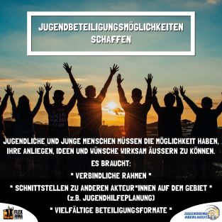 1. Jugendbeteiligungsmöglichkeiten schaffen: Jugendliche und junge Menschen müssen auf kommunaler Ebene die Möglichkeit haben, ihre Anliegen, Ideen und Wünsche äußern zu können und ggf. wirksam zu machen. Dafür muss ein verbindlicher Rahmen geschaffen werden. Diese Beteiligungsmöglichkeiten sollen auch als Schnittstelle zu anderen Akteur*innen dienen, wie etwa zu den Jugendhilfeplaner*innen des Landkreises. Die Beteiligungsformate sollten dabei vielfältig sein, um möglichst viele junge Menschen damit anzusprechen.