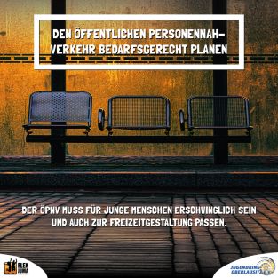 2. Den öffentlichen Personennahverkehr bedarfsgerecht planen:  Der ÖPNV im Landkreis muss für junge Menschen erschwinglich sein sowie auch der Freizeitgestaltung dienlich.