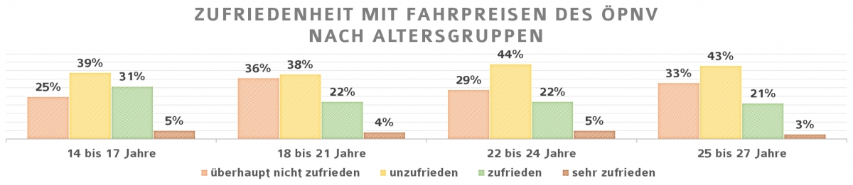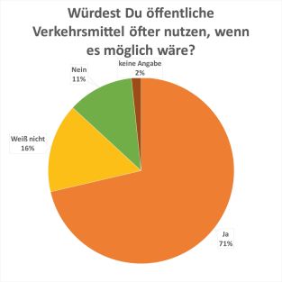 Ein weiteres wichtiges Thema, vor allem in größtenteils ländlichen Regionen, ist die Mobilität. Das am häufigsten genutzte Fortbewegungsmittel ist das Auto (39%). Es folgen „Laufen“ mit 22% und der ÖPNV mit 19%, danach das Fahrrad mit 14%. Fahrzeuge wie Moped, Mofa oder Motorrad nutzen nur 6% aller Teilnehmenden am häufigsten. Die Platzierung des ÖPNV ist nicht weiter verwunderlich, wirft man einen Blick auf die Zufriedenheit mit Preisen und Fahrzeiten des ÖPNV im Allgemeinen. Nur 4% gaben an, sehr zufrieden mit den Fahrzeiten zu sein, 28% sind zufrieden. Deutlich mehr Personen gaben an, damit unzufrieden (ca. 45%) und überhaupt nicht zufrieden (ca. 23%) zu sein. Ähnliches zeigt sich auch bei den Fahrpreisen. Sehr zufrieden sind nur 4%, zufrieden 25%, unzufrieden 40% und überhaupt nicht zufrieden 31%. Die grundsätzliche Bereitschaft und der Bedarf, den ÖPNV zu nutzen, ist aber vorhanden. 71% aller Teilnehmenden würden den ÖPNV öfter nutzen, wenn die Bedingungen entsprechend angepasst werden. Konkrete Vorschläge sind, die Fahrzeiten und Taktung zu ändern. Ein weiterer Vorschlag war sogar die kostenlose Nutzung des ÖPNV. Linien und Strecken sollen generell ausgebaut werden.