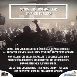 3. Sozio- und Jugendkultur stärker fördern: Sozio- und Jugendkultur kann als demografischer Haltefaktor wirken. Dazu muss sie jedoch stärker und vor allem langfristig gefördert werden, um wirken zu können. Vor allem für Jugendclubs kann es von Vorteil sein, Fördermöglichkeiten zu schaffen, die keinen hohen bürokratischen Aufwand haben. Es ist auch notwendig, dass Jugendarbeit nicht als Kann-Aufgabe angesehen und verlässlich finanziert wird, um Jugendorganisationen und -initiativen unterstützen zu können.