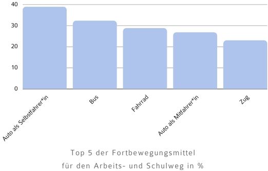 Im nächsten Schritt wurden die Fortbewegungsmittel abgefragt, die in der Freizeit der Teilnehmenden genutzt werden. Im Vergleich zum Schul- und Arbeitsweg werden hier das Auto als Mitfahrer*in (42,1 %) und das Fahrrad (39,9 %) häufiger angegeben und auch der Zug (31,5 %) spielt eine wichtigere Rolle. Das Auto als Selbstfahrer*in (39,2 %) und der Bus (27,3 %) finden sich ebenfalls in dieser Top 5 wieder.