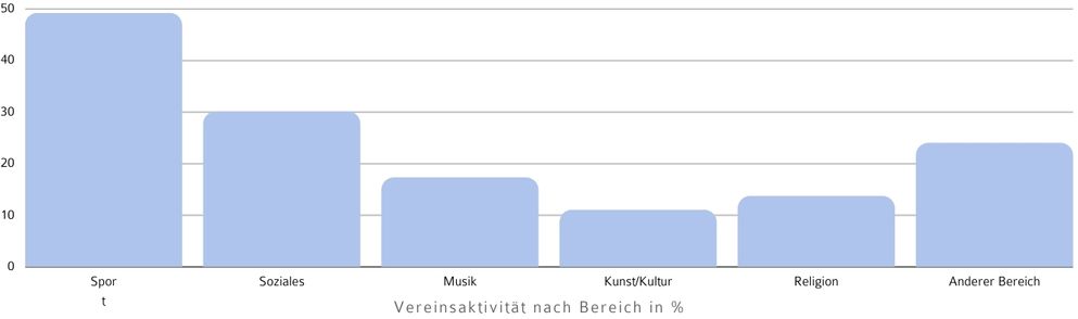 In diesem Themenbereich wurden verschiedene Aspekte der Vereinsaktivität der jungen Menschen im Landkreis erfragt. Zuerst sollten Angaben zu Vereinsmitgliedschaften gemacht werden. 49,1 % der Befragten gibt hierbei an, Mitglied in einem Sportverein zu sein, 30 % sind in Vereinen mit sozialen Themen aktiv. 23,9 % der Befragten engagiert sich in Vereinen, die sie nicht den anderen Kategorien zuordnen konnten. 17,2 % sind in einem musikalischen Verein aktiv. Noch weniger Jugendliche sind in religiösen und anderweitig kulturellen Vereinen Mitglied.
