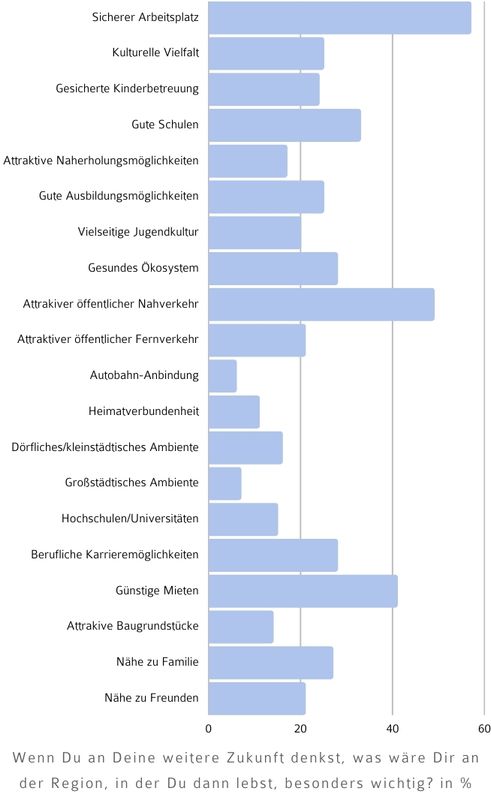 Abseits der Themen Freizeit, Jugendbeteiligung, Mobilität und Politisches Interesse wollten wir erfahren, was den jungen Menschen mit Blick auf die Region, in der sie später leben werden/wollen, besonders wichtig ist. Diese Perspektiven können aufschlussreich für die weitere Gestaltung des Strukturwandels sein, von dem unser Landkreis massiv betroffen ist.