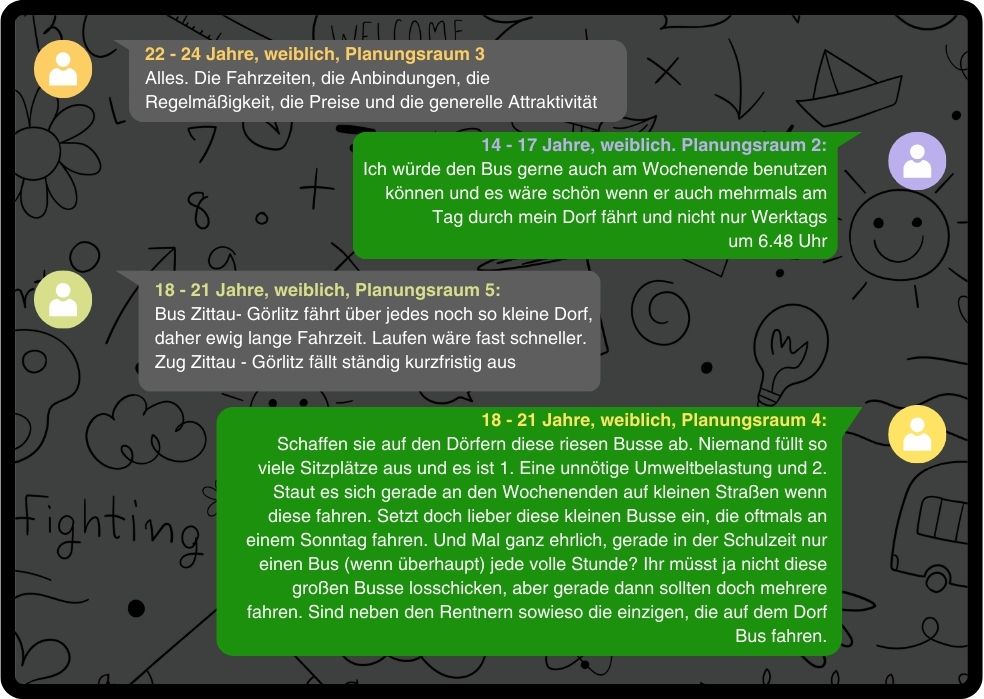 Auch im Bereich der Mobilität gab es in der Befragung die Möglichkeit, eigene Gedanken oder Vorschläge in einem Freitextfeld zu äußern. Etwa die Hälfte der Befragten hat diese Chance genutzt und dabei kristallisierten sich folgende Punkte heraus: Am häufigsten wünschen sich die jungen Menschen eine bessere Taktung und regelmäßigere Fahrzeiten der öffentlichen Verkehrsmittel. Auch die Fahrpreise, eine bessere Anbindung von Orten sowie die Wochenendfahrzeiten wurden hier oft genannt. Darüber hinaus gab es vielseitige Vorschläge zur Verbesserung der Situation, wie zum Beispiel eine genauere Anpassung der Fahrzeuggröße an die Anzahl der Nutzer*innen. Lassen wir die folgenden Originalzitate für sich sprechen: