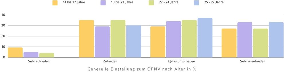 Vergleichen wir die Altersgruppen miteinander, wird deutlich, dass die Zufriedenheit mit dem ÖPNV mit steigendem Alter sinkt. So werden die allgemeinen Fahrplanzeiten und die Fahrpreise von den 14- bis 17-Jährigen vergleichsweise positiv bewertet, was möglicherweise an vergünstigten Dauerkarten für Schüler*innen liegen könnte. Im Umkehrschluss heißt dies aber auch, das gut Dreiviertel der 18- bis 27-Jährigen etwas bis sehr unzufrieden mit den Fahrplanzeiten und den Fahrpreisen ist. Insbesondere die Fahrzeiten an den Wochenenden spiegeln dabei eine große Unzufriedenheit. Dies schlägt sich auch in der generellen Einstellung gegenüber dem ÖPNV nieder. Sind noch 55 % der 14- bis 17-Jährigen zufrieden mit dem ÖPNV, haben 71 % der 25- bis 27-Jährigen eine eher negative Einstellung zum ÖPNV.