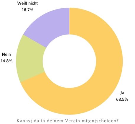70 % der Jugendlichen, die in einem Verein aktiv sind, geben an, dass sie dort auch mitbestimmen können. Das sieht in allen Altersgruppen die Mehrheit der Befragten so. Trotzdem gibt es auch hier Unterschiede. Je älter die Befragten sind, desto mehr können sie mitbestimmen. So steigt der Wert von 60 % bei den 14- bis 17-jährigen bis zu 80 % bei den 25- bis 27-jährigen an.