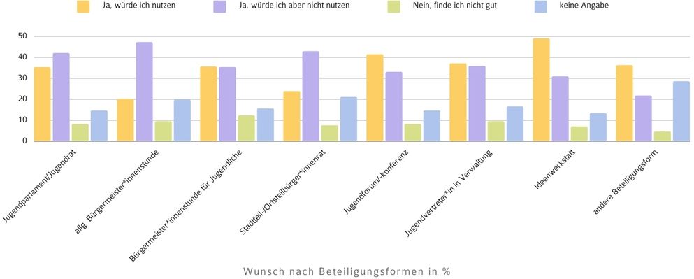 In einem weiteren Schritt wurde gefragt, ob sich die jungen Menschen wünschen, in ihrem Ort mitzuentscheiden zu können und welche Beteiligungsform sie bevorzugen würden. Die fünf meistgewünschten Beteiligungsformen der 14 - 17-Jährigen sind hierbei Jugendforum/-konferenz (35 %), Ideenwerkstatt (34 %), Jugendparlament/-rat (33 %), Jugendvertreter*in in der Verwaltung (31 %) und eine spezielle Bürgermeister*innenstunde für Jugendliche (27 %). Die Altersgruppe 18 - 21 Jahre gibt Ideenwerkstatt (44 %), Jugendforum/-konferenz (39 %), Jugendparlament und Jugendvertreter*in in der Verwaltung (je 36 %) und eine Bürgermeister*innenstunde speziell für Jugendliche (32 %) als gewünschte Beteiligungsformen an. Die 22 - 24-Jährigen wünschten sich Ideenwerkstatt (40 %), spezielle Bürgermeister*innenstunde für Jugendliche (25 %), Jugendforum/-konferenz und Jugendvertreter*in in der Verwaltung (je 24 %) sowie Bürger*innenräte (22 %). Die Altersgruppe von 25 - 27 Jahre gab hierbei Ideenwerkstatt (56 %), spezielle Bürgermeister*innenstunde für Jugendliche und Jugendforum/-konferenz (je 42 %), allgemeine Bürgermeister*innenstunde (36 %) sowie Bürger*innenräte und Jugendvertreter*in in der Verwaltung (je 33 %) an.