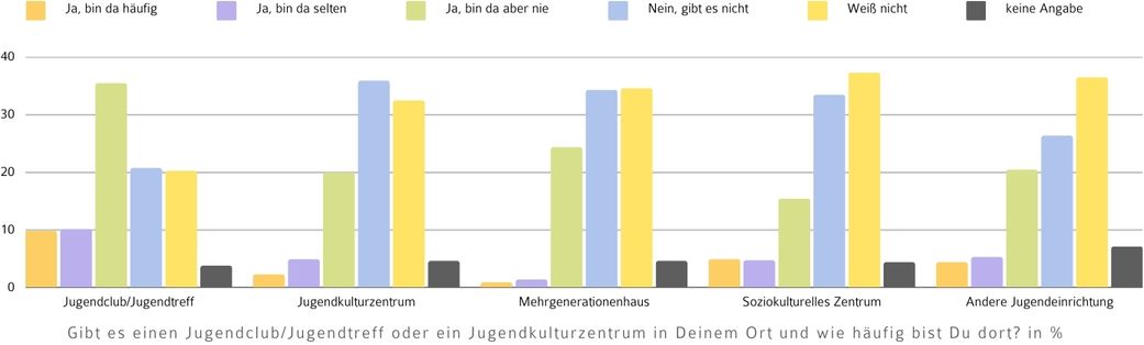Das Thema Jugendtreff bzw. Jugendorte wurde in weiteren Fragen genauer beleuchtet. Dabei zeigt sich zunächst, dass viele Jugendliche nicht wissen, ob es einen Jugendclub o.Ä. in ihrem Ort oder ihrer Umgebung gibt und ein großer Teil der Jugendlichen keinen Jugendclub o.Ä. im Ort vorfindet. Nur 9,8 % der Befragten geben an, häufig einen Jugendclub/Jugendtreff zu besuchen und 10,1 % scheinen diese nur selten zu nutzen. Über ein Drittel (35,4 %) der Jugendlichen antworten, dass es einen Jugendclub o.Ä. in ihrem Ort gibt, sie aber nie dort hingehen würden. Demgegenüber geben 40,6 % der Befragten an, dass sie sich einen Jugendclub in ihrem Ort wünschen würden. Bereits 2019 zeigte sich, dass Jugendliche vorhandene Einrichtungen wie beispielsweise Jugendclubs kennen, sie nicht nutzen, aber trotzdem weitere Einrichtungen wünschen. Das lässt sich mit der These der jugendlichen Raumaneignung erklären: während einige Jugendliche und Jugendgruppen sich bestimmte Räume aneignen, schließen sie dadurch andere Jugendliche vor Ort aus, die sich dann auch „eigene“ Möglichkeiten der Aneignung wünschen (Böhnisch und Münchmeier 1990, 121).
