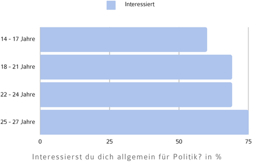 66 % der befragten Jugendlichen im Landkreis Görlitz beschreiben sich selbst als interessiert an Politik im Allgemeinen. Die Shell-Jugendstudie erfasste deutschlandweit einen Wert von 41 %. Damit stellt sich die Frage: Sind die Jugendlichen im Landkreis Görlitz besonders interessiert an Politik, oder wurden durch die Befragung nur Jugendliche erreicht, die sich für Politik interessieren und dementsprechend möglicherweise engagierter sind, an so einer Umfrage teilzunehmen? Unabhängig dessen variiert das politische Interesse je nach Altersgruppe und Geschlecht. So sind in allen Altersgruppen die Politikinteressierten in der Mehrheit. Mit steigendem Alter ist auch ein Anstieg dieses Interesses festzustellen. So liegt es bei den 14- bis 17-jährigen bei 60 % und steigt kontinuierlich bis zu 75 % bei den 25- bis 27-jährigen an.