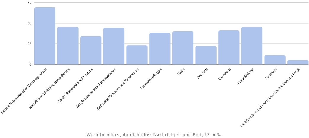 95 % der Befragten geben an, sich regelmäßig über Nachrichten und Politik zu informieren. Haupt-Informationsquellen sind dabei verschiedene Internet-Portale, z.B. Soziale Medien, Suchmaschinen oder Podcasts. Darauf folgt das persönliche Umfeld, hierbei vor allem der Freundeskreis und das Elternhaus. Die letzte große Quelle ist der Rundfunk, wobei Radio noch vor Fernsehsendungen steht. Printmedien spielen für die Befragten eher eine untergeordnete Rolle.